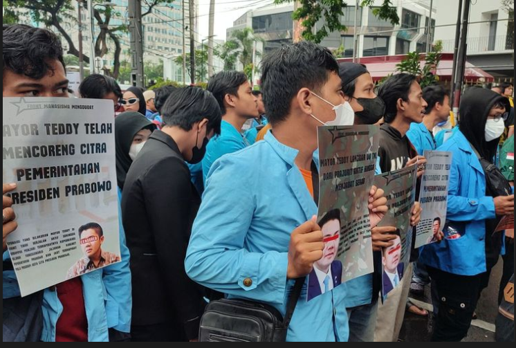Dalam aksi ini, mahasiswa membawa poster bergambar Mayor Teddy Indra Wijaya dengan tulisan yang menyoroti dugaan pelanggaran terhadap UU TNI serta perjalanan kariernya dari prajurit militer hingga menjabat sebagai Sekretaris Kabinet (Seskab).