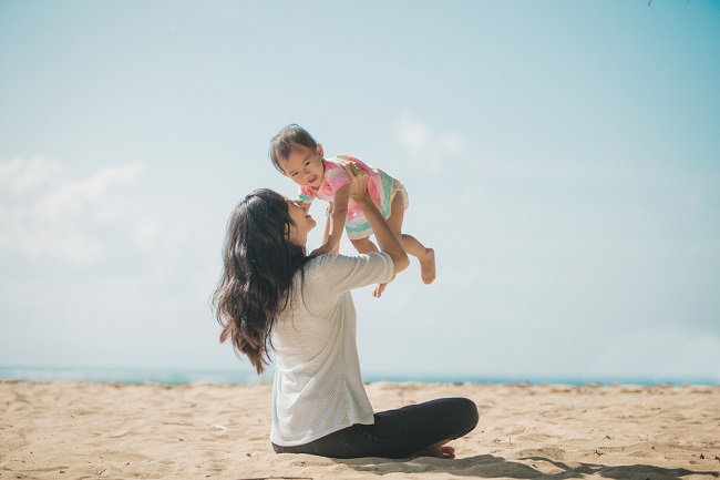 portrait of Happy mother and baby girl playing at seaside